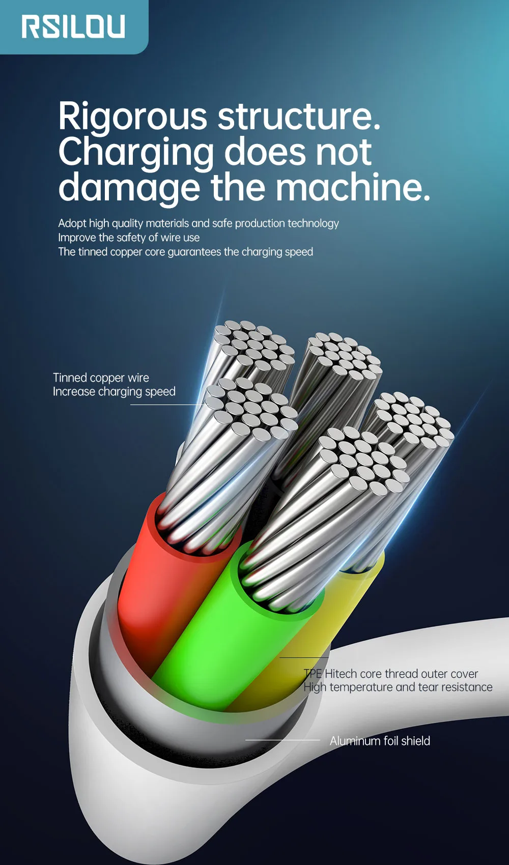 تم تصنيع الكابل بإستخدام 5 أنوية، رقائق ألومنيوم، أسلاك نحاس مطلية بالقصدير، وألياف مقاومة للقطع، مما يضمن أمانًا كاملًا أثناء الشحن ونقل البيانات ويقلل خطر التلف.