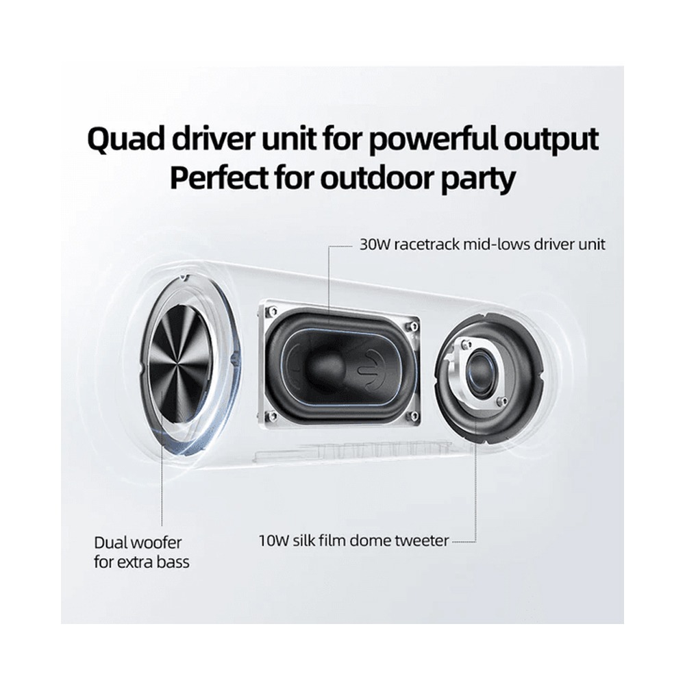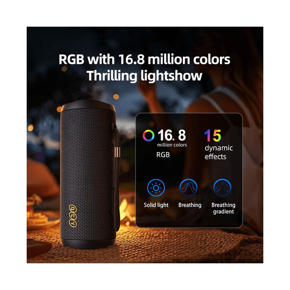 يتميز مكبر الصوت QCY SP7 بتقنية صوت ستيريو متطورة تعمل على توزيع الصوت بشكل متوازن، مع تعزيز الترددات المنخفضة للحصول على باس عميق ونقي، مما يجعل تجربة الإستماع أكثر متعة سواء للموسيقى أو الأفلام.