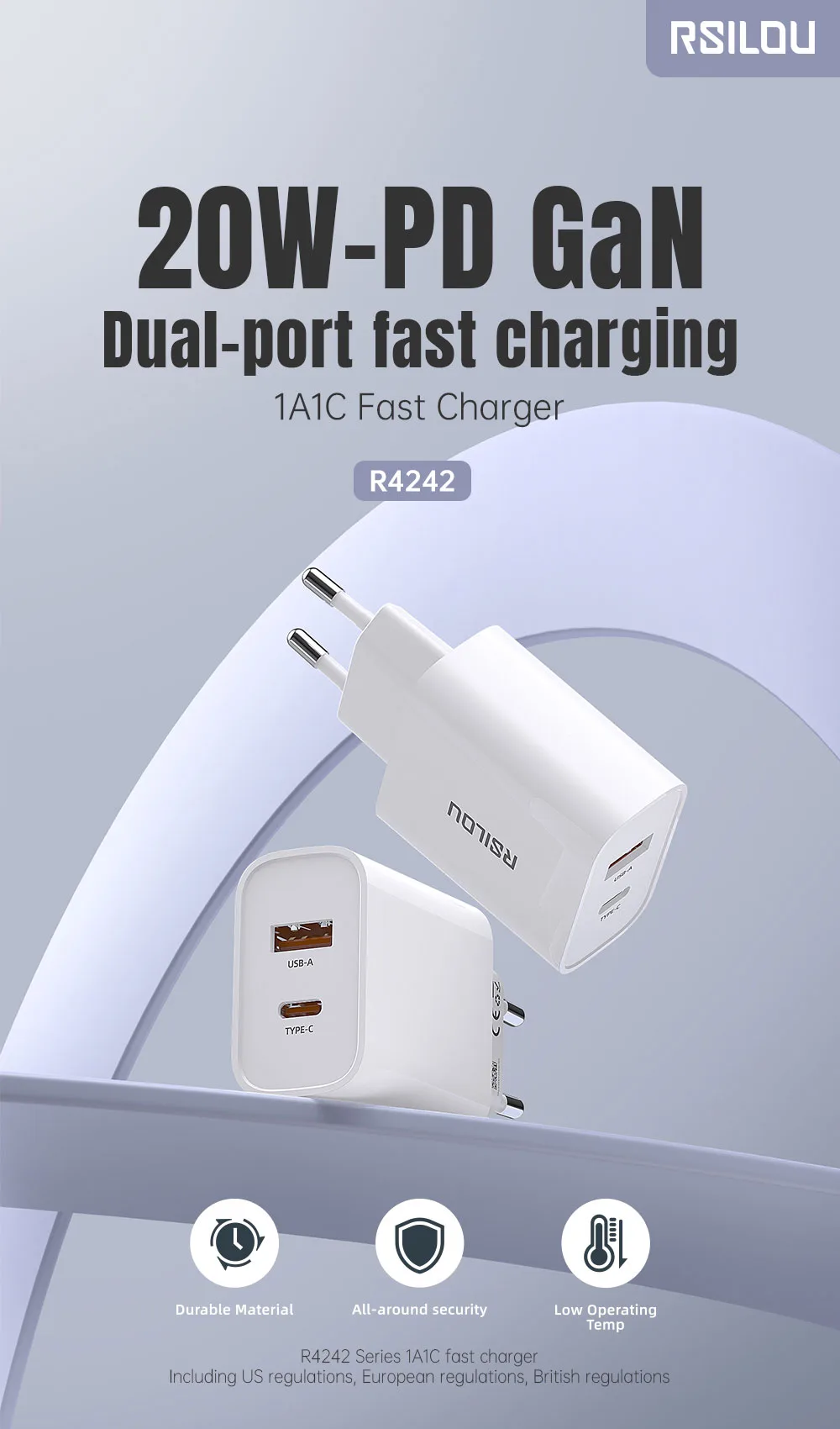 يعتمد شاحن RSILOU 20W على تقنية GaN الحديثة التي تضمن شحنًا أسرع وكفاءة أعلى مع تقليل الحرارة، مما يحسن من عمر الشاحن ويجعله أكثر أمانًا أثناء الإستخدام الطويل.