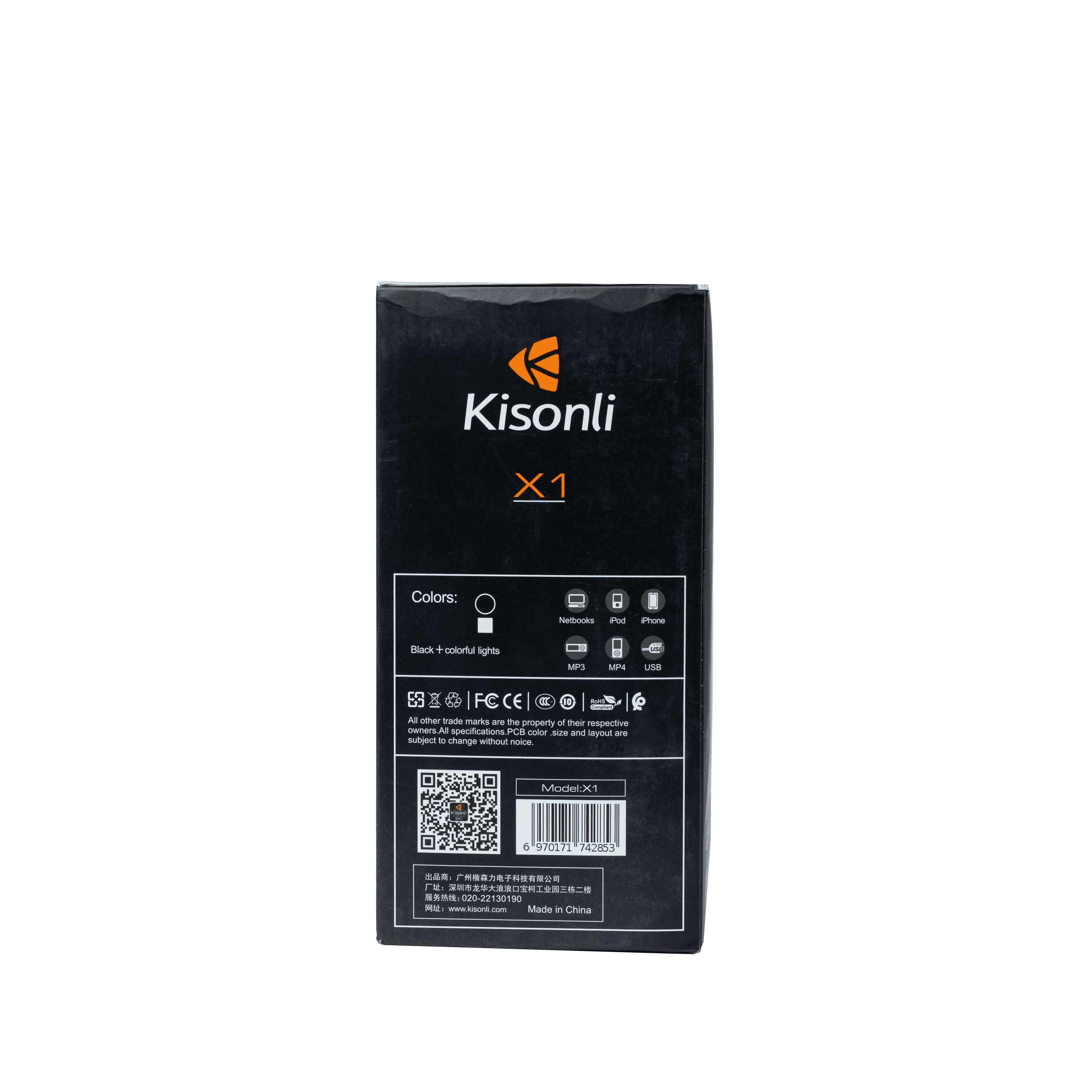 مكبر الصوت Kisonli X1 RGB المواصفات الفنية نظام السماعات: 2.0 مكبرات الصوت القدرة المقدرة: 5W * 2 الطاقة القصوى: 3.5W المقاومة: 4.Q نسبة الإشارة إلى الضوضاء: 80dB استجابة التردد: 150Hz-18KHz تشويه: DC5V / 1000MA-2A